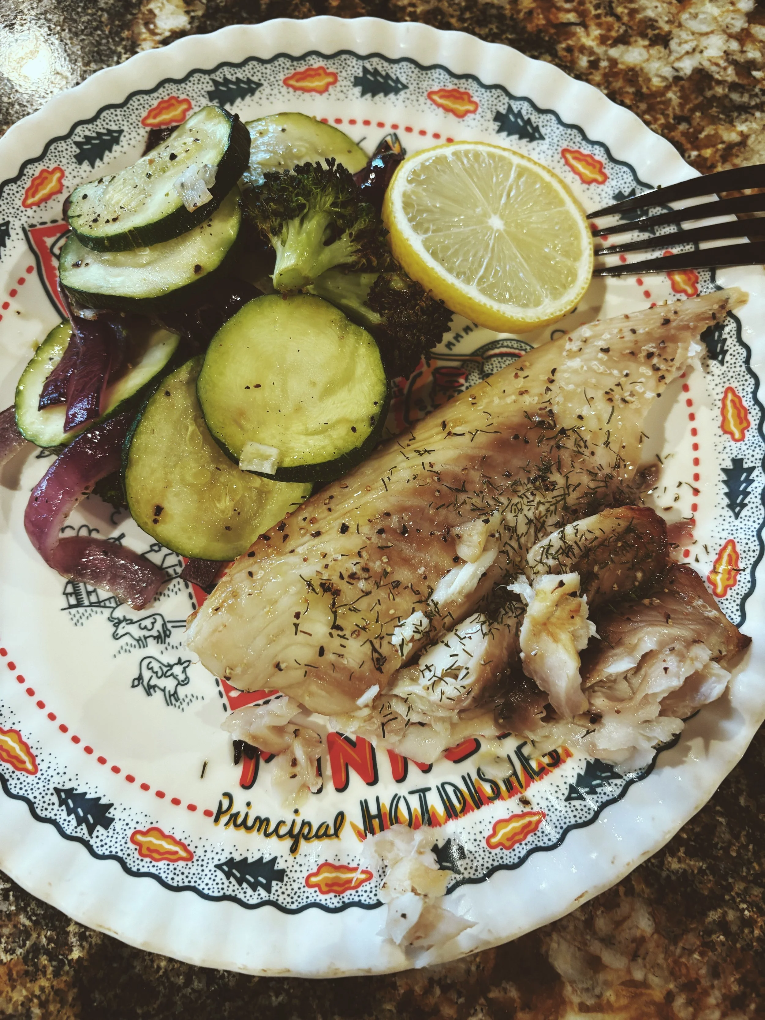 Bake 15–18 minutes until fish flakes easily and veggies are tender.