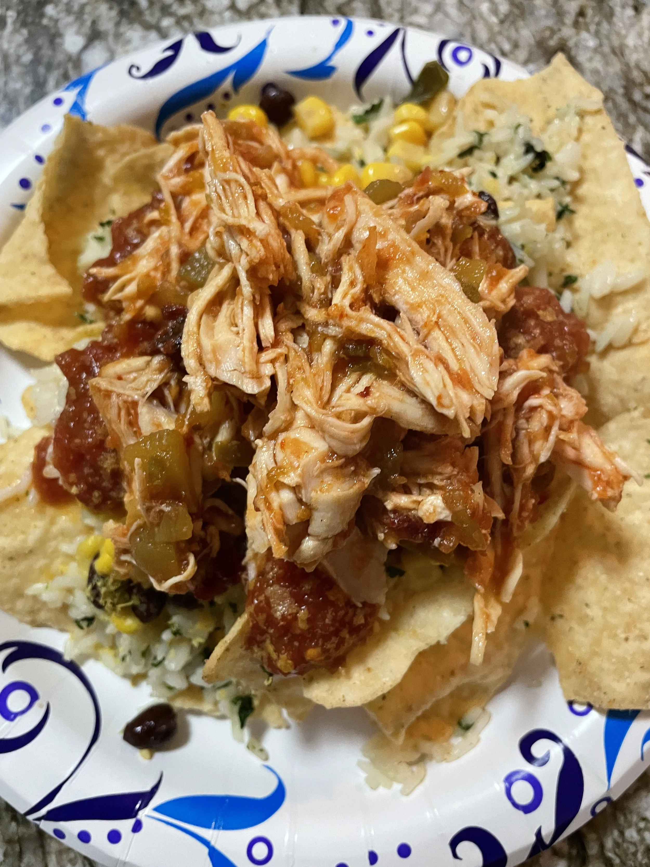 I did nachos- tortilla chips, cilantro lime rice, black beans/corn mix, meat, lots of nutritional yeast, and hot sauce.
