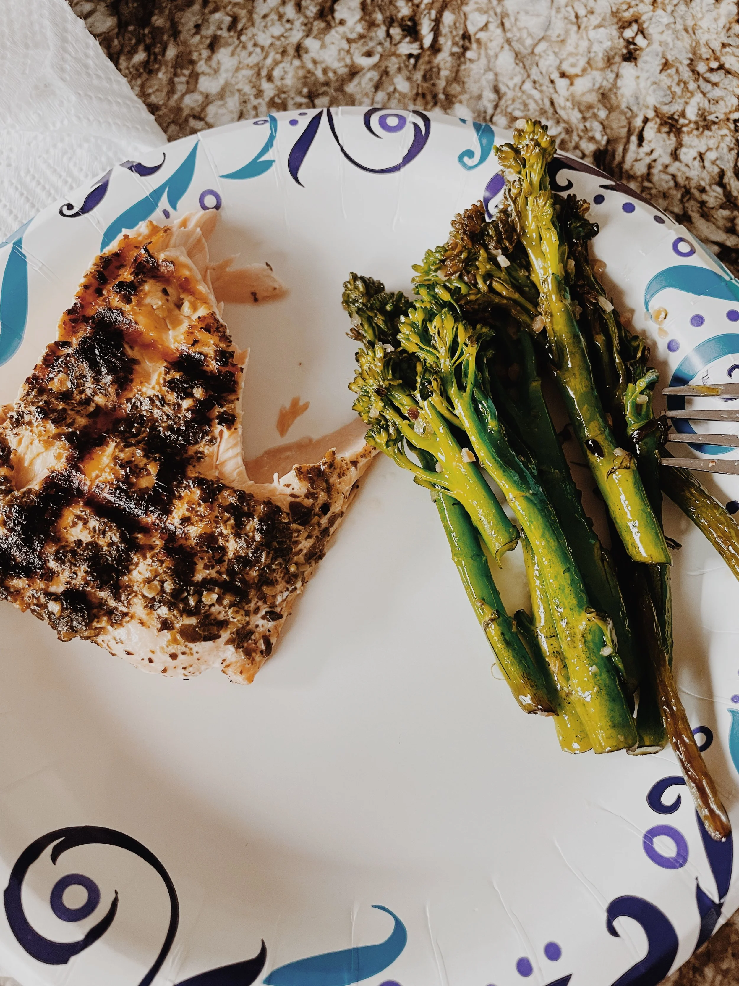 I used olive oil on the George Foreman grill and then put the salmon on. I topped it with Pesto sauce and closed it to finish cooking. Then I just steamed the broccolini with some minced onion and garlic.