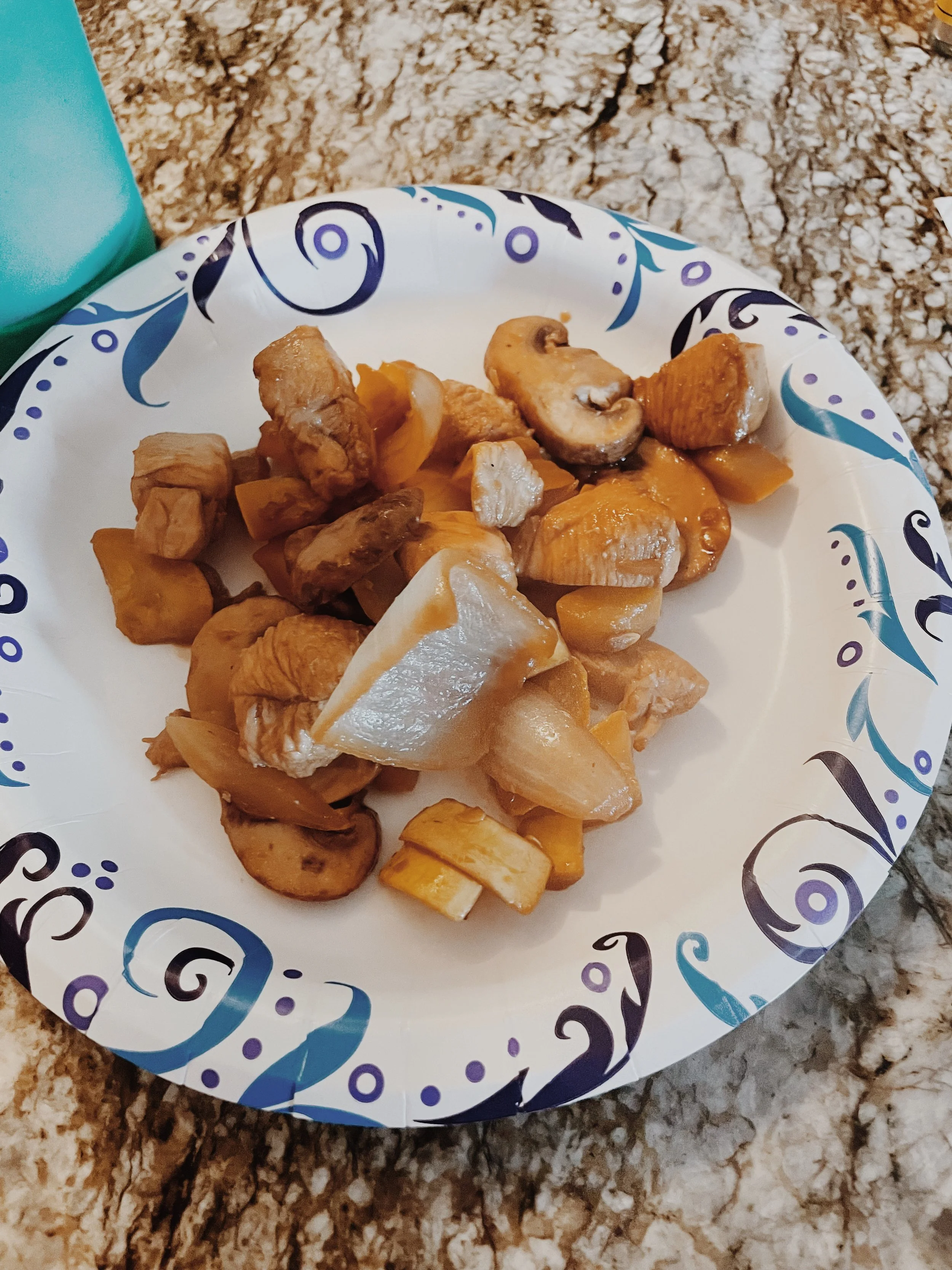 I bought a sugar free Polynesian sauce (link here) and I ate with my parents so we used the Blackstone to cook the veggies, chicken, and we added some shrimp. We grilled the pineapple separately and just added it after everything was cooked. We used maybe 6T of sauce for the entire meal. It was very very good.